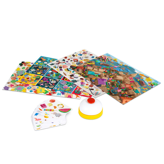 A player draws a card and leaves it in the center of the table. Read the word and try to find the object on your picture card. Each object is depicted differently on each card! Be the first to find the object, press the bell and win the card! Action cards can turn the game upside down. Get your opponent looking from a distance or upside down!