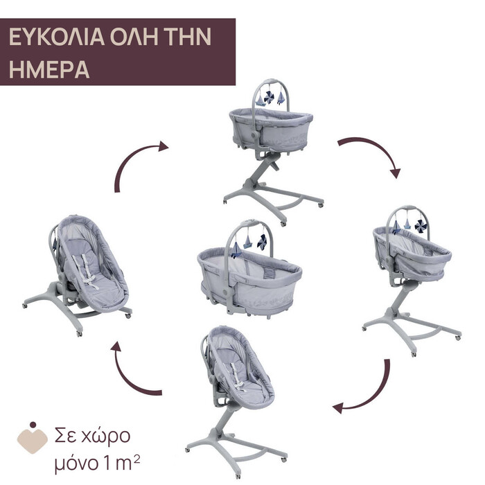 An exclusive 5-in-1 solution that simplifies everyday life. It functions as a standalone crib, a raised crib, a raised recliner, a high chair, and a first chair, following the child’s growth from 0 to 36 months. The portable crib, detachable from the base, is the perfect solution for a multi-story home.