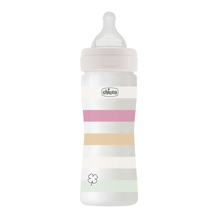- The Chicco Well-Being 330ml plastic bottle offers maximum practicality with an ergonomic design, making it easy to sterilize and dishwasher-safe.
