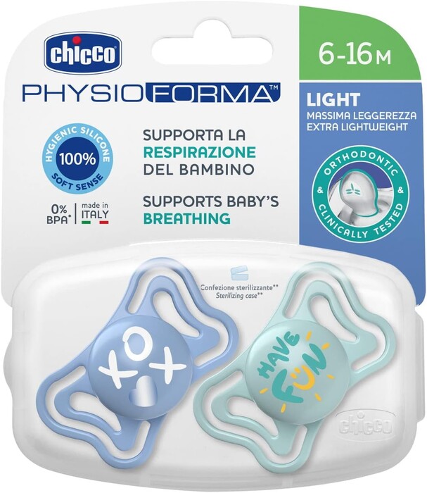 PhysioForma Design: All Chicco pacifiers are made with the PhysioForma anatomical and functional design, developed specifically to support and stimulate vital mouth functions while maintaining the natural tongue position.