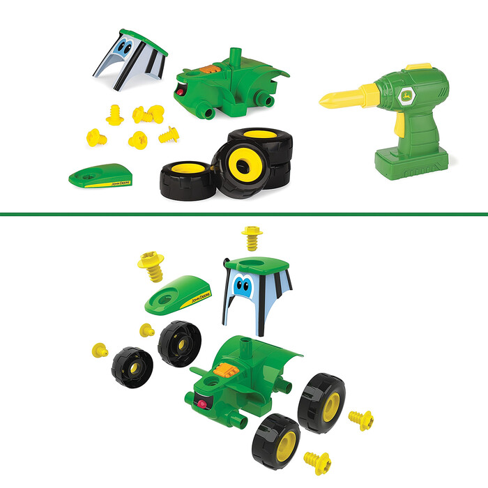 This toy tractor features two ways to play: free rolling tractor or buildable set. This 16-piece set includes a battery powered drill to take apart and build Johnny Tractor back together again. Made of chunky parts, easy for little hands to assemble. Includes power drill with 2 bits and 13 Johnny Tractor pieces.