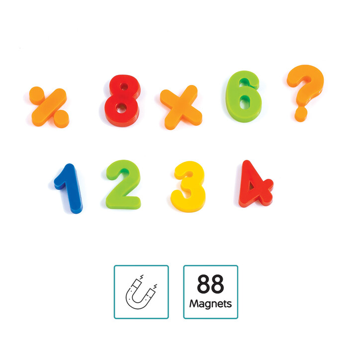 An educational game with 88 plastic magnets of numbers and arithmetic symbols, teaching the child the numbers and helping them get acquainted with simple and basic arithmetic operations. All magnets are placed in a practical bucket with a handle, ideal for easy transportation and storage. Learn the numbers and start using the arithmetic symbols to start doing your first arithmetic operations.