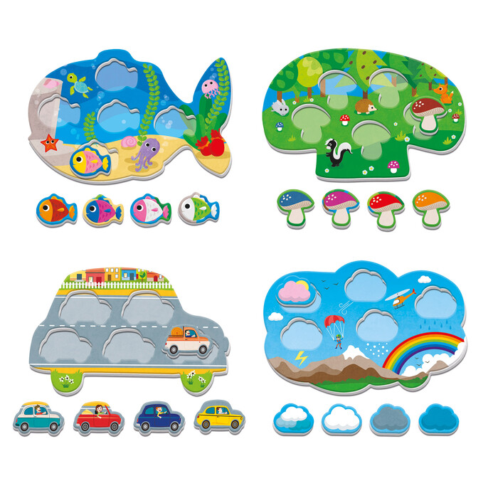An observation and sorting toy suitable from early years. The child chooses a tab and overlaps the pictures with the corresponding cards. In a second phase of the game he learns the names of the objects depicted in the pictures. So the activity is initially sensory, visual recognition and then language development. It contains themed tabs with pictures (objects, animals, fruits, etc.) and cards with the same pictures to be combined with those on the tabs.