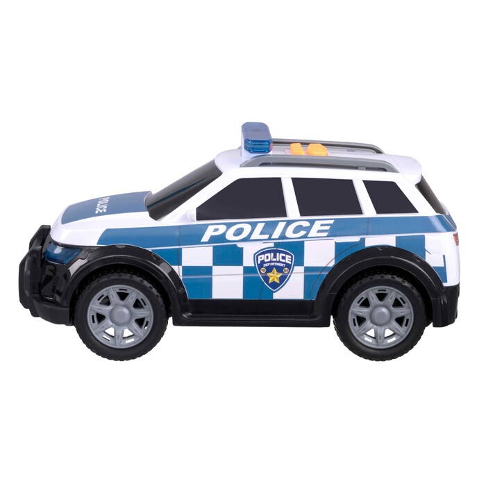 To the rescue with Teamsterz Light and Sound Police Car! Free Wheeling police car with blue flashing lights,engine and emergency siren sounds.