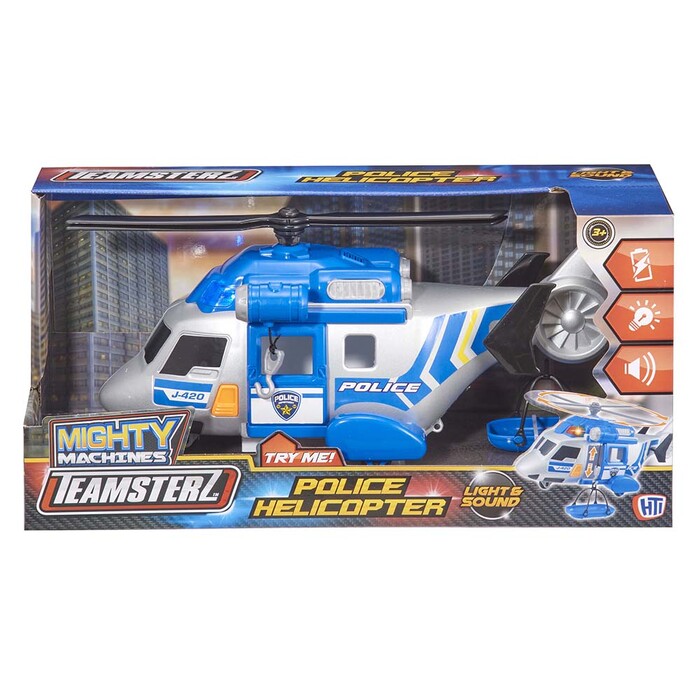 To the rescue! With the Teamsterz lights & sound Police Helicopter! Manual operated rotor blades and winch with stretcher. Opening side door. Perfect for indoor or outdoor play. Flashing lights, rotor, siren and action sound.