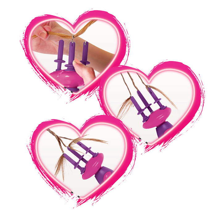 Press downwards to spin each thin braid together until the thick braid is done. - Hold and Release your hair with care and tie the end using the elastic bands. The box contains: - 1 hair braider - 25 elastic bands - 4 glitter bands *Functions with 2 batteries AA(LR6) (Not included).